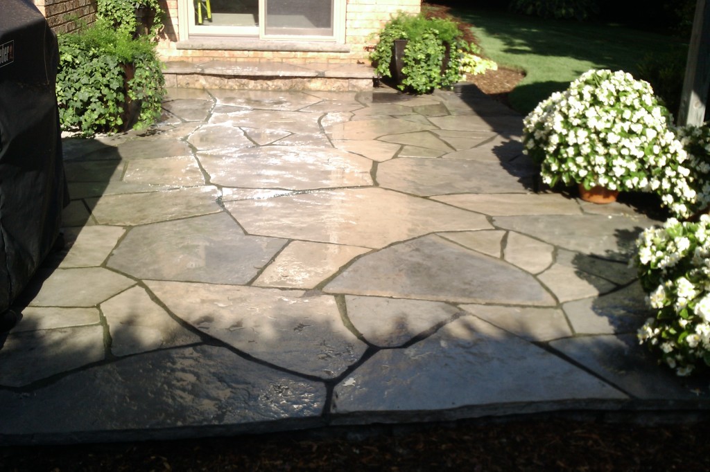 Replacing a rotting deck this patio had to be raised one step above lawn grade. It was necessary to build a small retaining wall to support the patio & keep a proper grade.